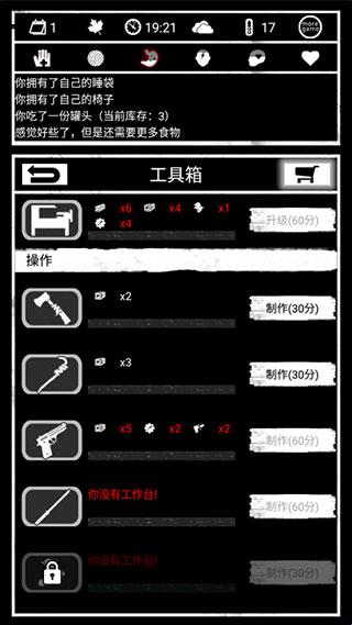 工具间的第一次升级和第二次升级一定要尽快(如何尽快?记得看升级缺少什么,就在其他地方拿什么回家),第一次升级后出鞋子和衣服(觉得自己工作间马上能升第二次了,可以先不建衣服,直接造最终的防爆服),除了床和沙发以外,之前我没有提到的建筑先不要建,建了也暂时用不上,只会让自己陷入资源短缺。