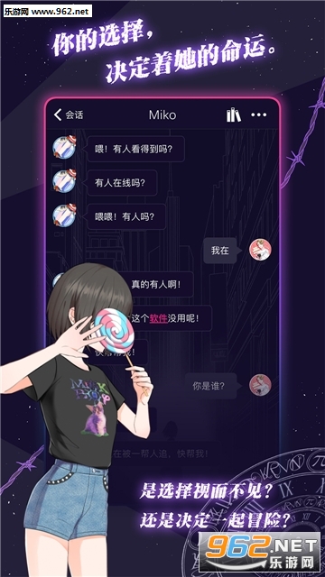 这是一款充满冒险与刺激的文字对话互动应用。应用虚拟一位陌生人给你实时传送信息,而你将决定主角的命运。因完全采用模拟现实通讯,所以请注意你的消息,主角随时可能需要你的帮助。另外主角也需要睡眠时间以及活动时间,你需要等候主角上线才能继续进行对话交流。