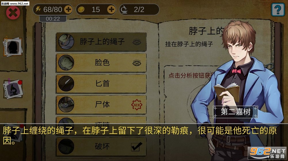 @二狗子丶 侦探题材的解谜游戏,乐友们在游戏中需要扮演一个新手侦探,平时总是接到一些调查婚外情或者小猫小狗不见的案子,不过最近接到一个项链被偷的案件,调查之后发现事情并没有表面那么简单,从一件小盗窃案牵扯出一个疑云重重的谋杀案。游戏上手很简单,不过玩家需要调查现场,找出各种疑点,再就是询问证人和被害人的证词,通过分析证据,把所有的思绪在大脑中理清楚,最后得出结论,锁定嫌疑人,给出最终的证据,就能够结案了!