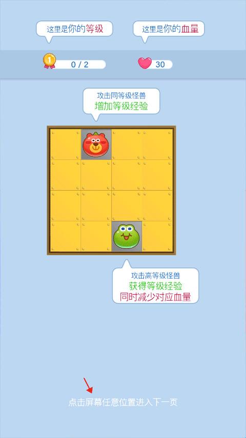 3、你需要注意的是:如果攻击同等级的怪兽就会增加等级经验,而攻击高等级怪兽,同样也会获得等级经验,但是会减少对应血量。