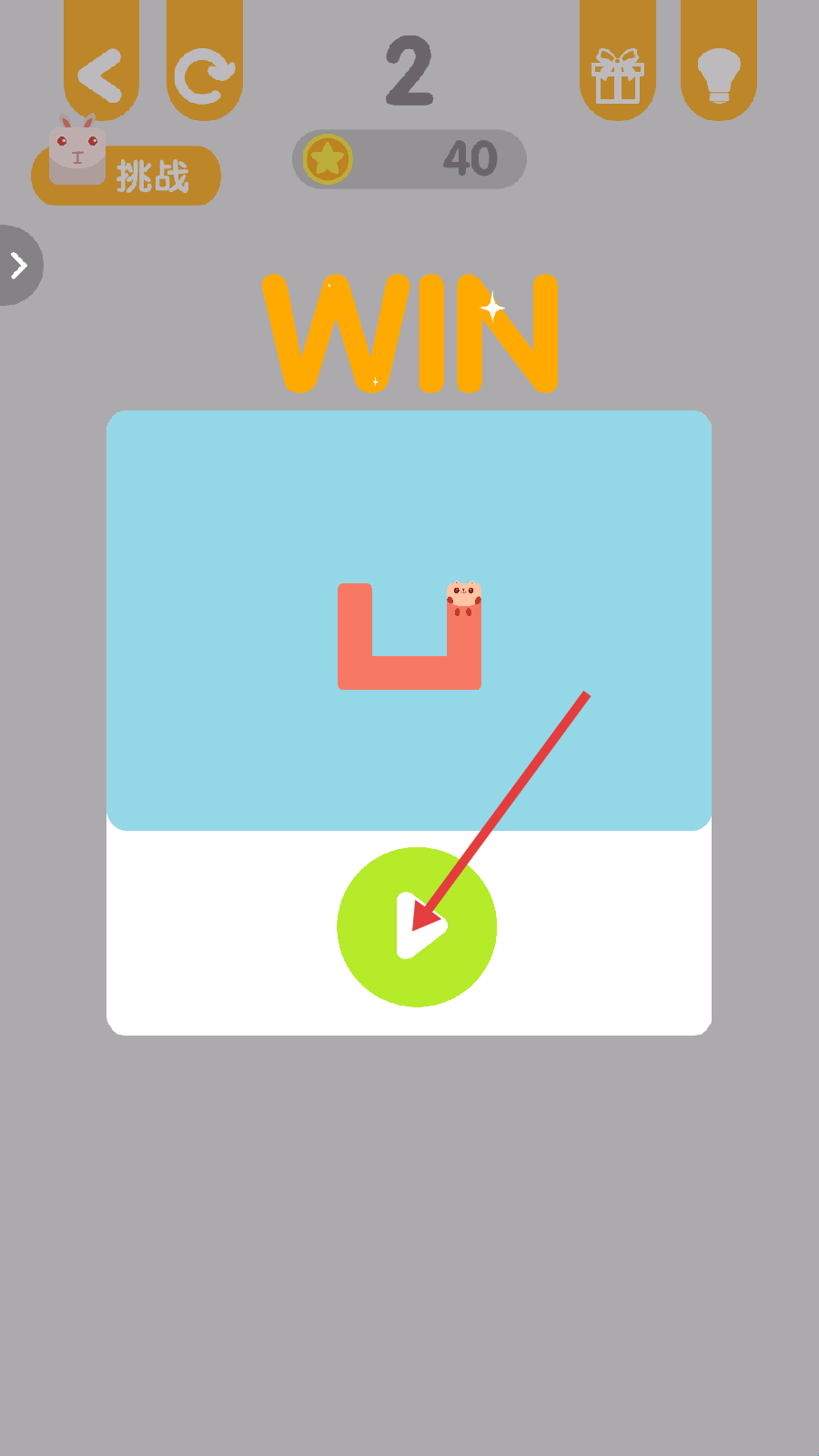 4、通关后点击绿色箭头按钮,进入下一关,积累星星提升【挑战】进度,解锁新关卡。