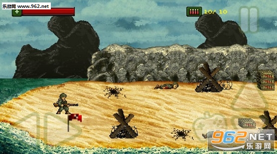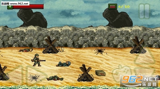 这是一款2D像素版的第二次世界大战射击游戏;你将扮演一名登陆海滩的士兵,在这场战斗中与敌人战斗。不断的前进,不断地与敌人战斗,地上的地雷、敌人的手榴弹都是你需要注意的。敌人也会跟你做出相同的躲避子弹的动作,不要急,在他站起来就给他一梭子,你就可以继续前进了。