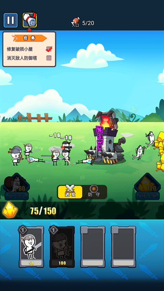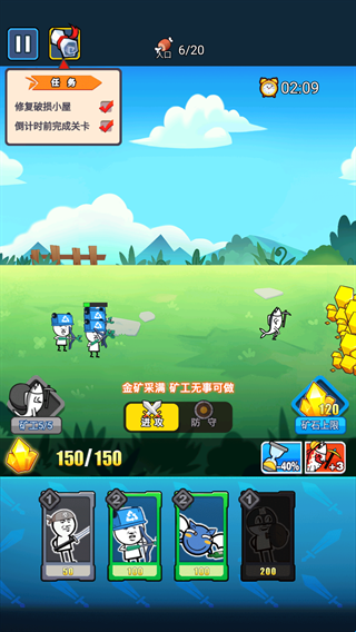 1、游戏中玩家需要操控矿工去挖矿,将矿物用来养兵,利用养出来的兵防守或者进攻,直到摧毁敌方的防御塔为胜利,己方防御塔被摧毁则失败。
