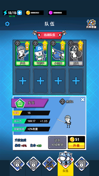 4、其中还有兵种的卡牌养成系统,这边个人是建议主要升级前排兵的。因为后排兵其实本身的属性并不弱,再加上他门是站在后面受到保护的,所以说其实只要前排兵能保住后排兵,那么后排兵就会拥有更高的输出机会。反之,前排兵不够肉,没办法保护后排兵,那后排兵即使等级再高,活不下来也没有办法输出。所以说个人建议主要升级前排兵,把前排兵弄得够肉了,再来考虑升级后排兵