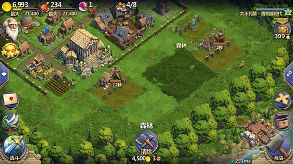 1、在时代发展过程中,玩家可进行领土扩张,也就是砍伐森林扩大领地,每次扩大领地都能够发现更多未被探索的资源:宝箱、长颈瓶、金矿、遗迹等,还会出现佣兵营地,和一些石堆树林。