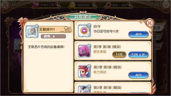 此类碎片可副本获得,但掉落是有概率的,体力的限制下需要时间慢慢获得,而抢夺就是个更省时间的办法,点击碎片可以打开获取途径界面,其中有抢夺手段,点击前往。