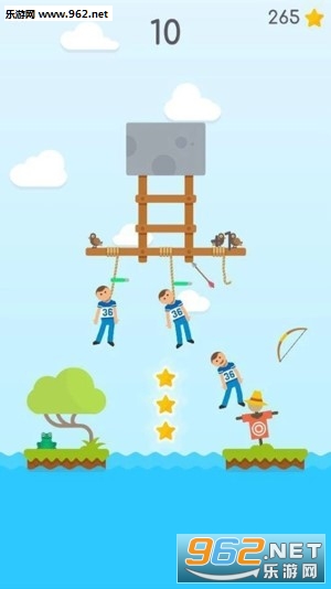 2、滑动屏幕,估算射箭的轨迹,准确地将吊人的绳子射断