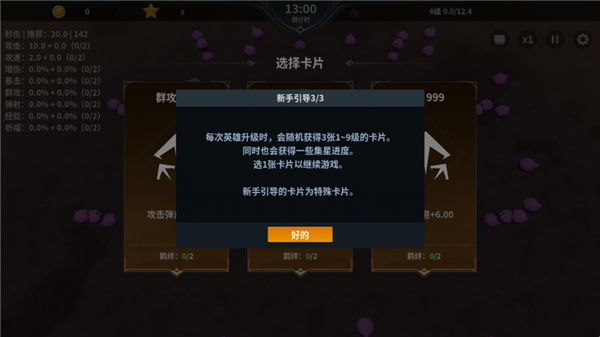 3、每次击败后英雄就会升级,并会随机获得3张1-9级的卡片,同时也会获得一些集星进度,选择一张卡片继续游戏;