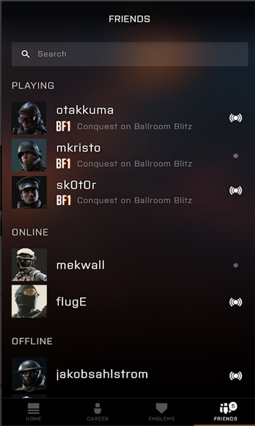 好友列表可以让你轻松地监视你的战地好友。每天总结一下你的朋友在玩什么,或者关注最喜欢的朋友,准确地知道他或她在玩什么。