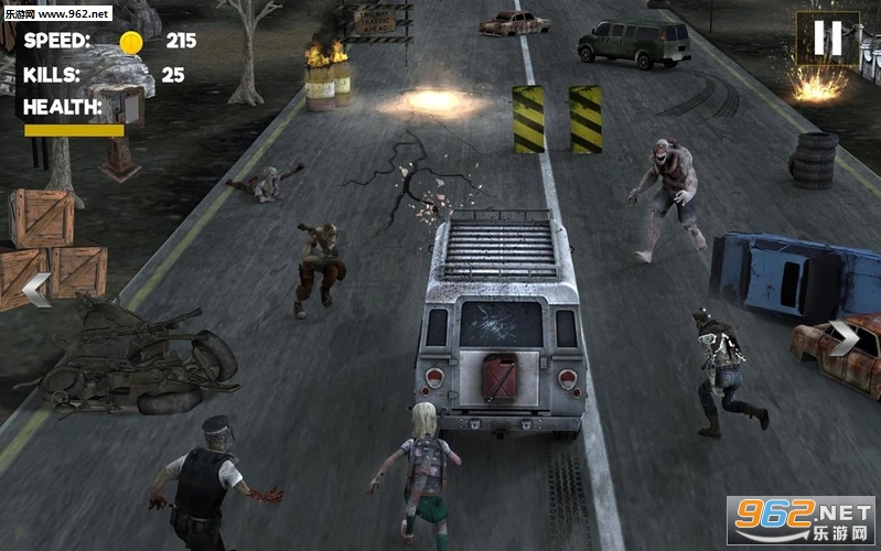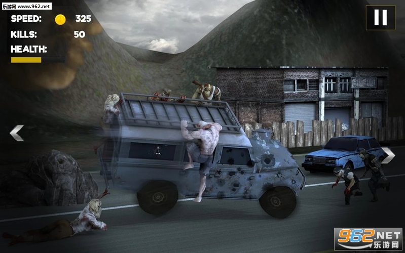 4、在城市公路上与僵尸赛跑并获得金币。操控吉普车撞碎僵尸吧!