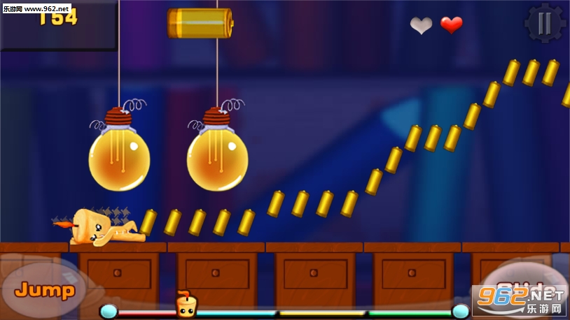 游戏中你控制着一个闪闪发光的电池小人。你需要做的很简单,就是跳起,或者爬下,在跑动中,不停地收集电池。达到一定数量后你就会变身、加速,尽可能的多收集目标和达到目的地就是你的目标。