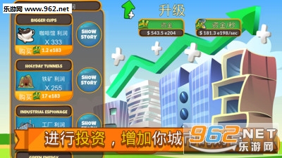 作为一款闲置型游戏,游戏在后台运行期间,你的城市也会升级和扩张。点击放置的游戏机制让你只需轻松点击即可建造并管理你的企业,所以只要管理有序,城市的扩张只是时间问题。