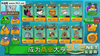 《模拟商业大亨安卓版》是一款放置玩法风格的点击向模拟经营类游戏,你将管理一个大型的度假村城市,通过各种方式吸引人们前来带动GDP的增长。游戏的放置玩法将让你不用投入太多时间,即使是在后台也能够良好运行。