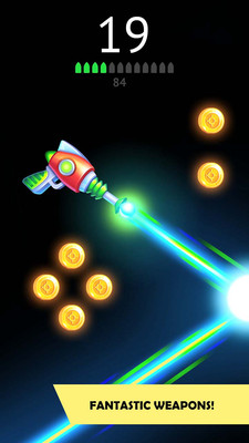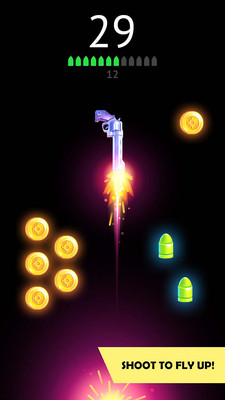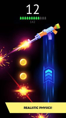 《转动枪安卓版》是一款射击游戏,只需要触摸屏幕或枪械就可以飞行,这里一共有15把枪械需要你来解锁,每一把枪械都有限定的子弹,我们需要用开枪时枪械的后坐力来飞行,通过后坐力来实现枪械的转动,以及躲避障碍物,Nitro标志是用来帮助你飞行更高的的地图道具,同时尽可能的收集金币在途中筹集资金,金币可以帮你解锁任何的枪械,找到最适合你的游戏风格的武器。