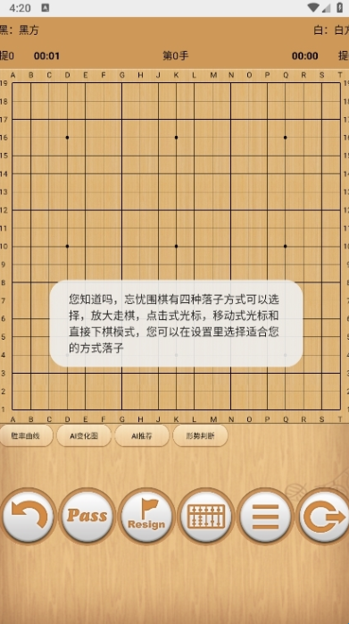 4、忘忧围棋除了19路外,还支持9路,13路棋盘,适合新手入门。