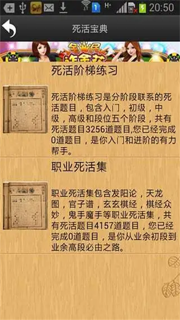 1、死活宝典:死活宝典是围棋教育的扛鼎之作,当前最强大的死活库。收录了7000+道死活题。从入门级到专业级,从古代死活经典到现代职业高手死活题。包括发阳论,天龙图,官子谱,玄玄棋经,棋经众妙和鬼手魔手等专业死活集。是您提高围棋棋力的良师益友,是你从业余10级到业余5段的必由之路。