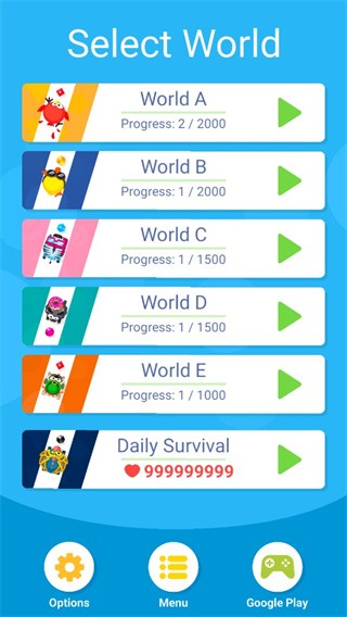 4、在《点点冲刺》中共有1000道关卡,游戏内容丰富程度比起其他采取无尽模式的同类游戏来说也基本是有过之而无不及,不知不觉中闯关得停不下来也属正常,是打发闲暇时光的一大利器。
