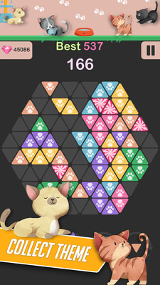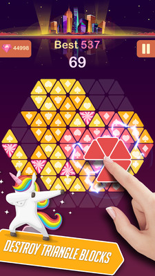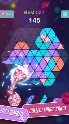 三角形糖果-块益智游戏很简单-在六角形板上,放下不同形状的三角形块,以便在屏幕上垂直和水平创建和破坏整条线。一次清除多条线以获得钻石。组合,连接和销毁拼图块形状!
