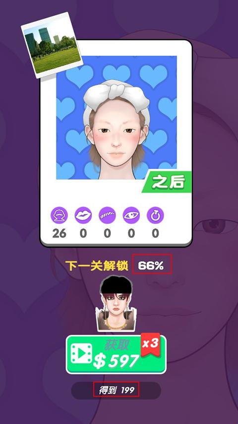 3、玩家需要一步一步完成关卡进度,当进度达到100%就可以完成化妆啦!