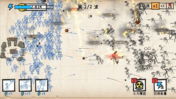 纸上战争重铸文明拥有丰富多样的关卡挑战,不仅可以根据玩家的操作水平来自由调节难度级别,还可以按照你的喜好自由选择并搭配不同类型的兵种进行战斗,游戏画风设计非常有趣,就好像是在作业本上涂鸦,让你在对决的过程中也可以缓解自己的压力,沉浸式的感受纸上战争对决的乐趣。