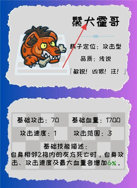 3、鬣犬霍哥攻击型传说品质棋子,基础攻击70、血量1700,攻速1、范围3,技能为相邻2格友方死亡时,自身攻击、攻速、最大血量各增6%。