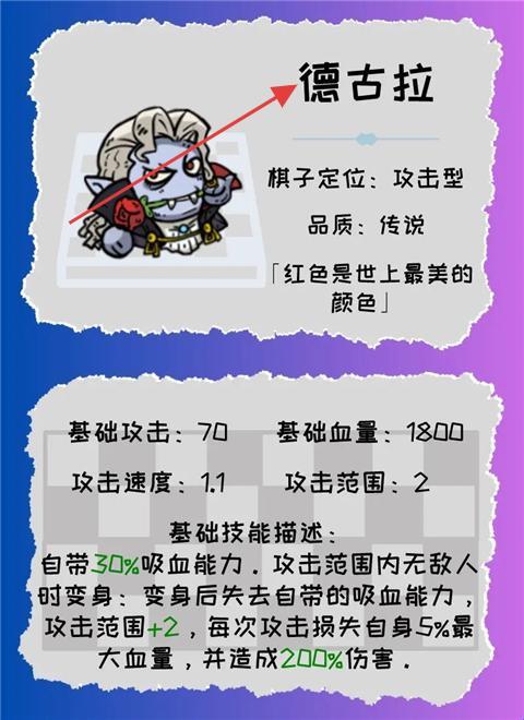 2、德古拉攻击型传说品质棋子,基础攻击70、血量1800,攻速1.1、范围2,技能含30%吸血,无敌人时变身,攻击范围+2,攻击损5%最大血量并造成200%伤害 。