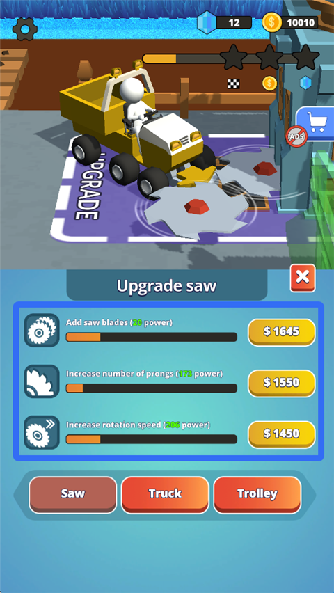3、售卖草赚取金币后,需要即使升级收割机配件,可以添加锯片、增加锯齿数、提高旋转速度。