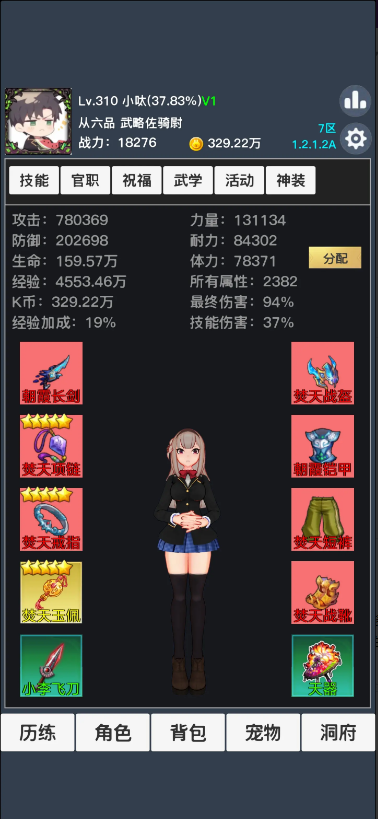 4、进入角色面板,这里可以学习技能、穿戴装备、学习武学等。
