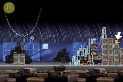 3、凤梨隐藏在箱子堆下右侧的箱子里头,同样贴了个标签。向高空发射一只蓝色的小鸟,如果它准确着陆了就可以炸开这个箱子。因为难度较大,所以你可能得多次连击,才有可能炸开箱子。