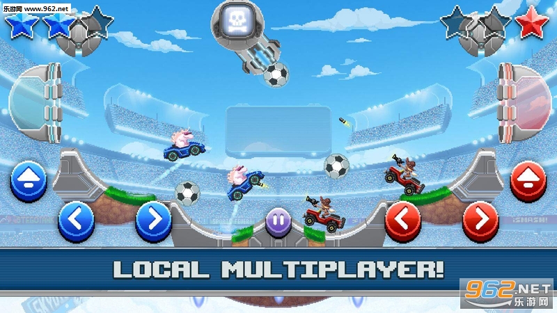 《撞头赛车足球运动》是一款十分另类的足球手游,你可试曾想过开汽车去踢足球?现在,这一有趣的想法在这里得到了实践,你将驾驶各种各样的载具将这个可怜的足球撞来撞去,撞进对方球门即可得分。快来加入这场疯狂而有趣的比赛吧!