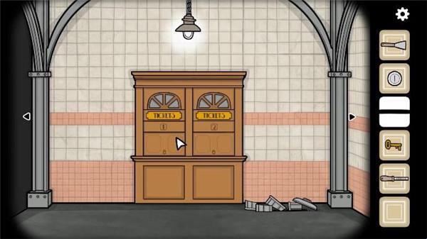 8、然后我们去把站台上的种时间调到10点15分,列车就进站了,然后点击列车员,会提示我们需要车票。点击列车员右边的口袋,可以获得一枚硬币,之后我们回到放箱子的地方,去看排水管,用锉刀将断裂的水管取下来,获得断裂的水管和钥匙。