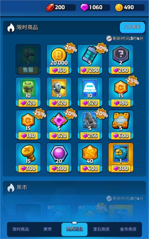 3、各位玩家可以每天进入到免费商店的页面,将所有完成刷新的免费道具全部逐一的领取,各位可以通过此方式在游戏当中获得各种类型的基础材料道具。领取的过程当中,也可以利用这些道具去提升防御塔和作战单位的等级,部分情况下,免费的技能升级元素也会在商店当中获取到。