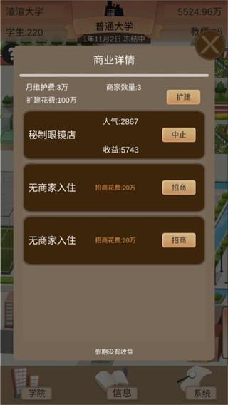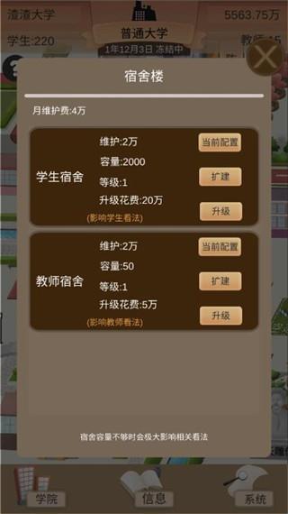 3、宿舍的支出分为两块,一块儿是升级,可以带来可观的学费收入。一块儿是维护费,受等级和容量影响,容量要按照你的招生数建设,不然维护费你扛不住。