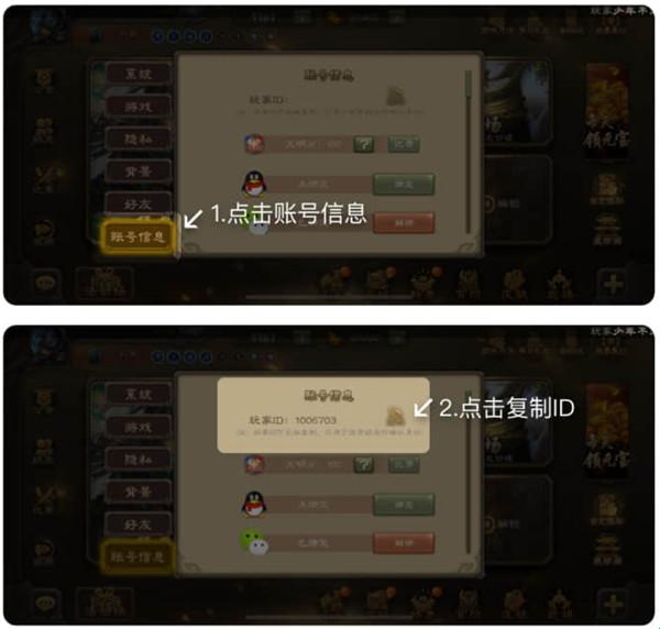 2、在账号信息中,复制自己的ID,然后在三国咸话中进行填写。