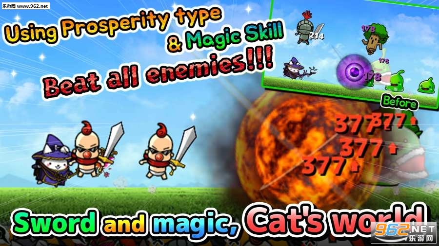 对任何人来说都很容易玩!超级可爱的猫和超简单的RPG!当然,游戏怪物和儿童也是受欢迎的!拍拍你的角色!他们有时会表现出他们的特殊动作!进攻是最好的防守!猫继续前进!