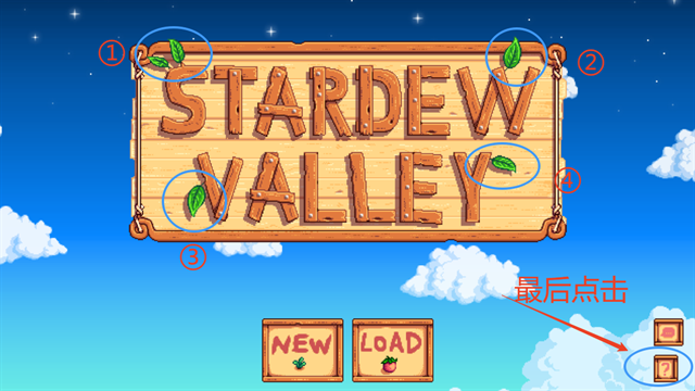 1、安装星露谷物语手机版,进入游戏后,需要点击数字叶子位置,如下图所示:依次顺序②②-③③-①④-①④。