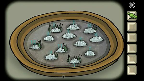 2、完成荷叶跳跃后进入小岛,在妹妹身旁的水盆内依顺序点击蛙卵,得到第二只青蛙;