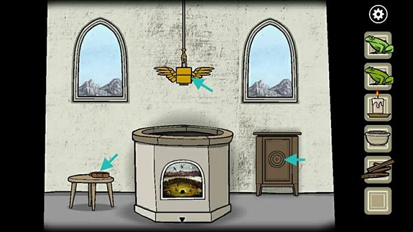 4、到湖边拾取木柴,再返回屋内取走凳子上的腰带,旋转屋内的机关轮盘,解锁右侧柜子,获得蛙笛;