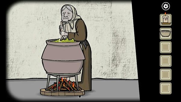 7、在小屋内放置木柴并用蜡烛点燃,将四只青蛙依次放入锅中煮成青蛙汤;