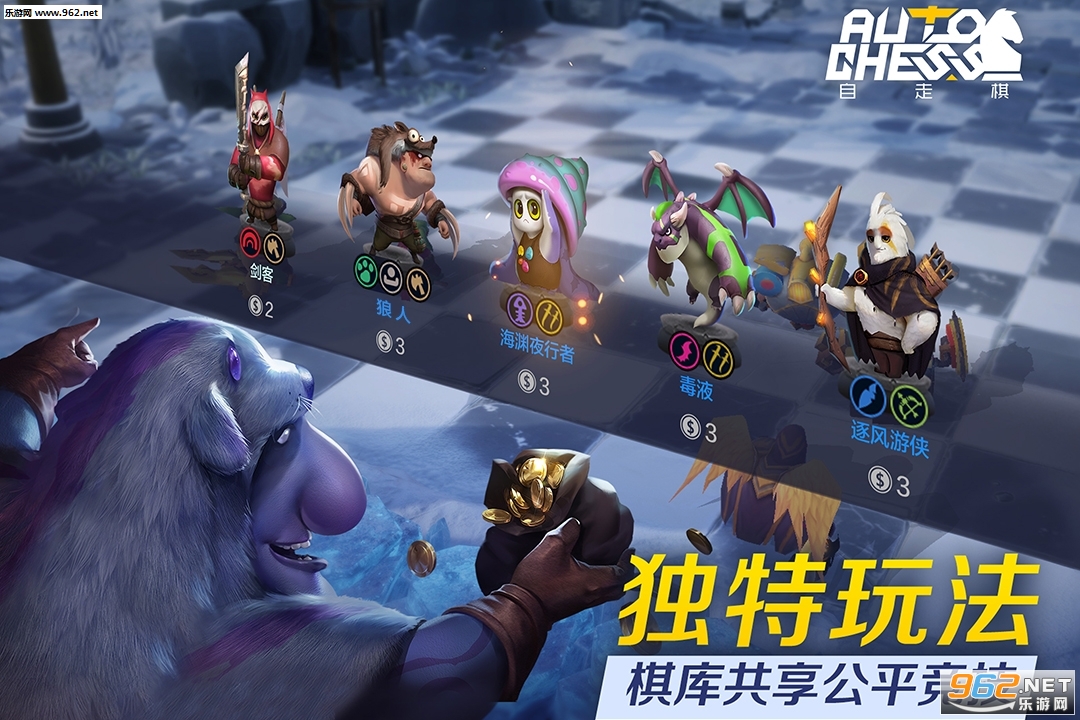 棋手们使用在共享卡池中随机抽取到英雄,从无到有搭建自己的专属阵容。进化、组合、卡位,将玩家的策略空间提升至极限。究竟谁能适应战场环境,组建一支终极“棋兵”并存活到最后?