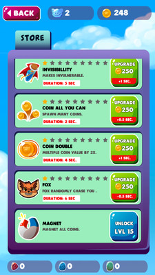 从游戏中,如果你看到一个苹果,立即取出它们,因为它们会给你力量!它会给你额外的努力来收集硬币并使其成为最好的。尽可能多地收集硬币,这样你也可以升级这些PowerUps,让它变得更容易,也不太可能被贪吃狐狸吃掉。
