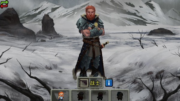 点击开始游戏进入到游戏之中,一开始游戏会有四个角色让玩家选择,分别是战士,法师,游侠,女猎手。本作中每个角色都有各自完全不同的技能属性,例如战士力量较高,吃任何食物都可以回复5点体力,而盗贼闪避较高,更善于侦查门和陷阱,且更耐饥饿等等,玩家可以根据自己的玩法喜好随意选择。