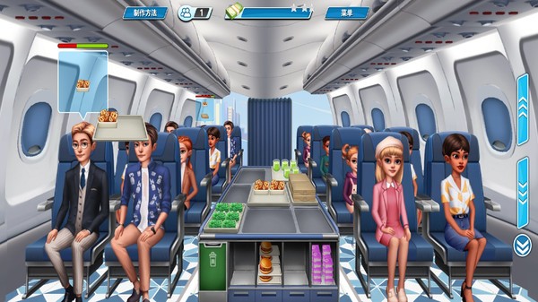 1、场景与画风精致:采用卡通画风,还原了经济舱、商务舱等不同舱位的场景细节,蓝天白云的背景搭配餐具碰撞等温馨音效,营造出沉浸式的云端服务氛围。