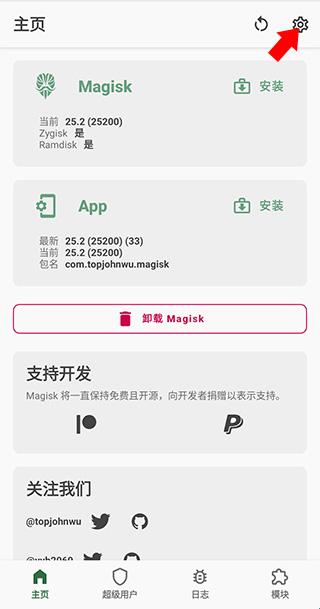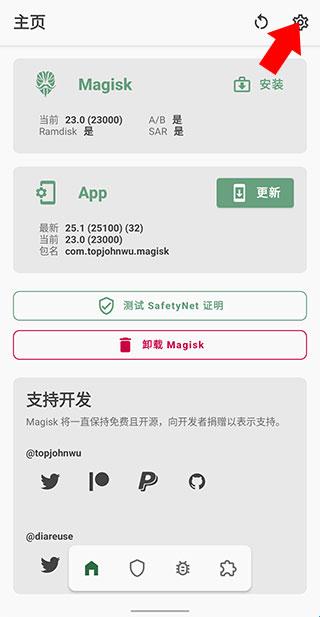 2、接着就是配置屏蔽列表了,与上方24.2版本类似但又有些不同,首先来到Magisk首页,点击上方的设置按钮。