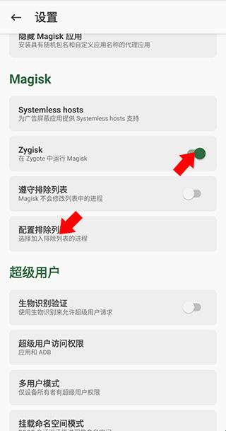 3、来到设置界面后往下滑,找到Zygisk选项,并点击后方的按钮将其开启,接着点击配置排除列表。