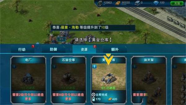 7、继续建造黄金仓库,接下来升级司令部,提升司令部等级将解锁更多的建筑,如图所示