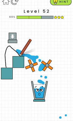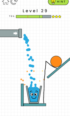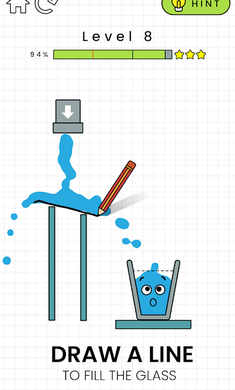 游戏画面中有一个空杯子与一个水龙头,水龙头会放出水出来,玩家需要画一条线条,让水龙头的水可以自然流入空杯子中,根据流入空杯子的水量,来得出玩家赢得获得关卡星数,有机会获得一颗星,甚至三颗星。