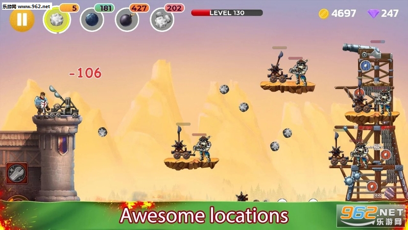 弹射战争 - 是一款街机上瘾游戏,你必须摧毁敌人的弹射器。游戏的目标很简单 - 举行城堡摧毁敌对的弹射器。你将在城堡塔楼上放置一个巨大的弹射器,向敌人投掷石块和炸弹并摧毁敌对的弹射器。