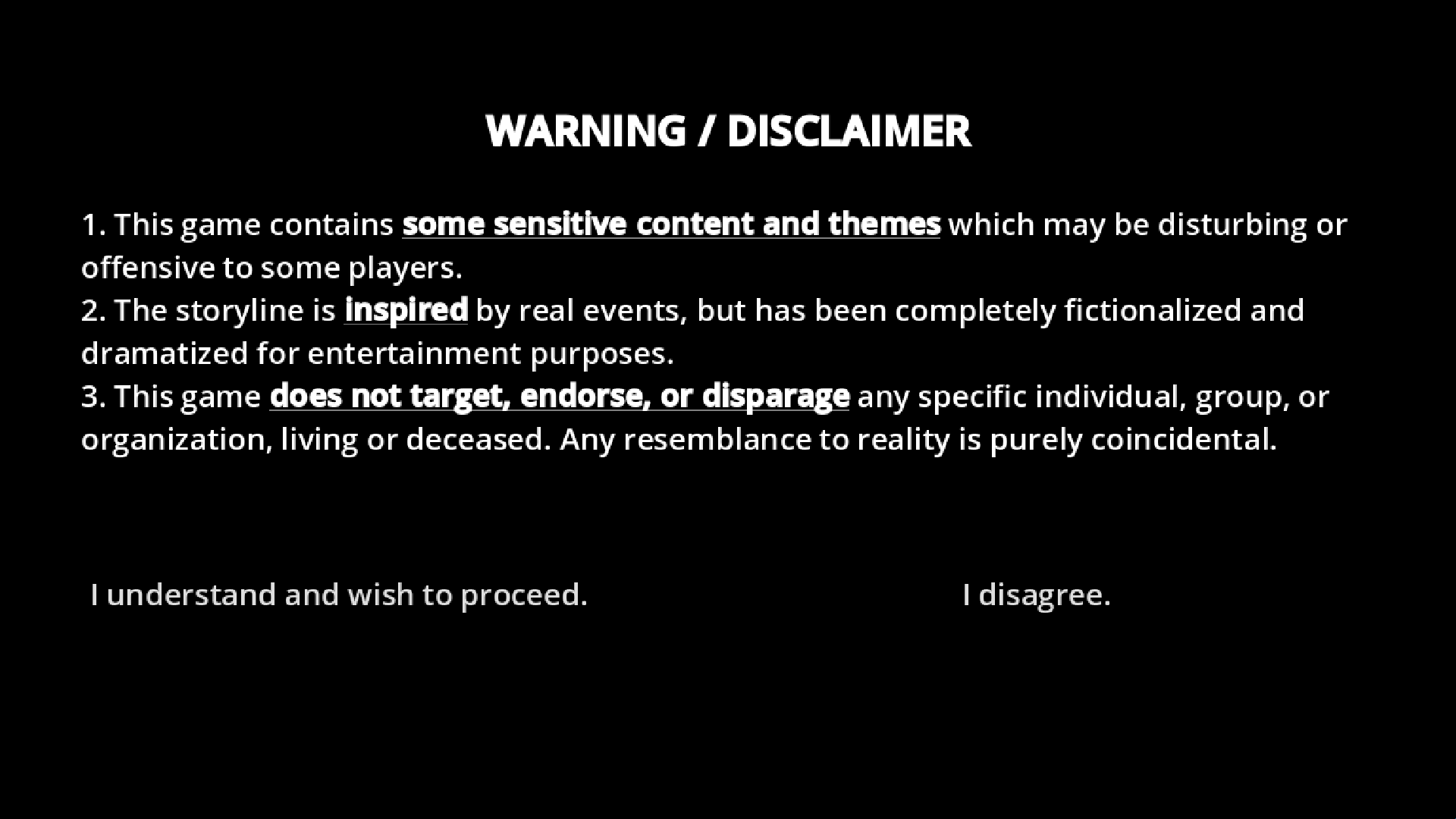 2、选择好语言后会出现一个警告,大致意思就是游戏内含恐怖或是其他可能导致玩家不适的内容,如果大家身体不舒服千万不要勉强哦。点击下方左侧选项继续;