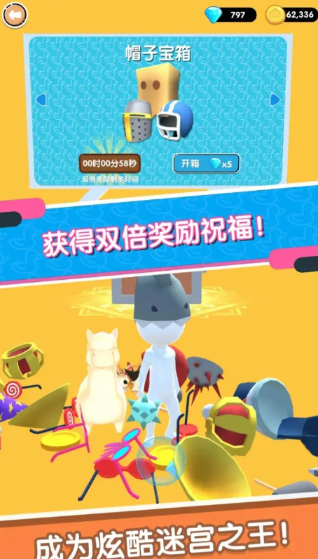 点击打开闯关界面玩家可以通过屏幕上显示的去利用钻石购买宝箱,或者观看广告来获得双倍奖励。